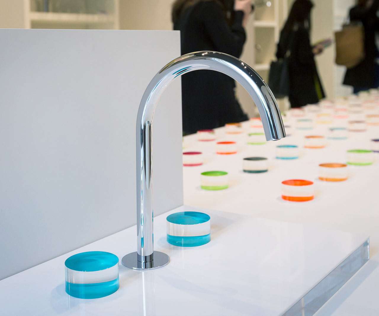 How is it made? Nice bathroom fixtures includes mixer taps and a vast range of knobs, available in different colours. Each knob is a translucent cylinder; this specific material produces special optical illusions, adding a playful touch to your bathroom.