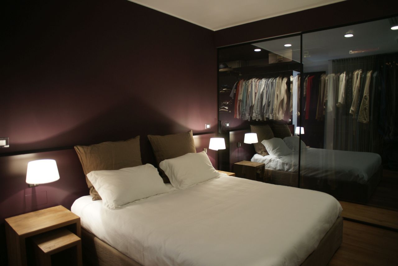 In the master bedroom: bespoke walk-in closet with sliding doors by Rimadesio. Sommier bed by Radaelli, Flamant coffee table.