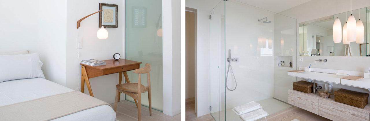 Different materials are used in the private area of the house, although the soft, delicate shades are a constant. The floor is made of wooden planks from Scandinavia. Simple and refined too, the crisp furniture includes classic Scandinavian pieces of the fifties as well as several modern designs. The overall scheme conveys a calm warmth, a serene welcome that encourages you to relax.