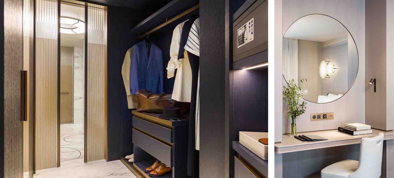 Personalised solutions have been developed for every room, they combine the stylistic requirements of Jean-Michel Wilmotte’s project with the technical constraints of the building’s historic structure. The fixed furniture, floors, ceilings, wooden cladding for the walls, doors, panelling and headboards fit to the last inch with the technical equipment, security system, air-conditioning and home automation system for a tailor-made solution that for four years required the efforts of 50 people such as technicians, draftsmen and managers from the Contract division by Lema.
