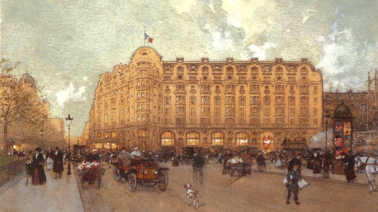 A painting of the Hotel Lutetia shortly after it opened in 1910 with the first cars on the Boulevard.