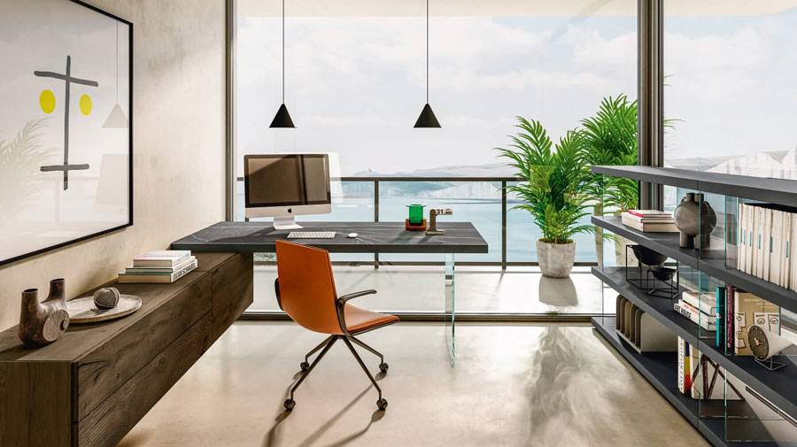 This composition embraces the whole room and provides the most functional home office. To the left, there is a suspended sideboard which the peninsula extends from with a marble-effect surface and a transparent leg.