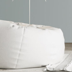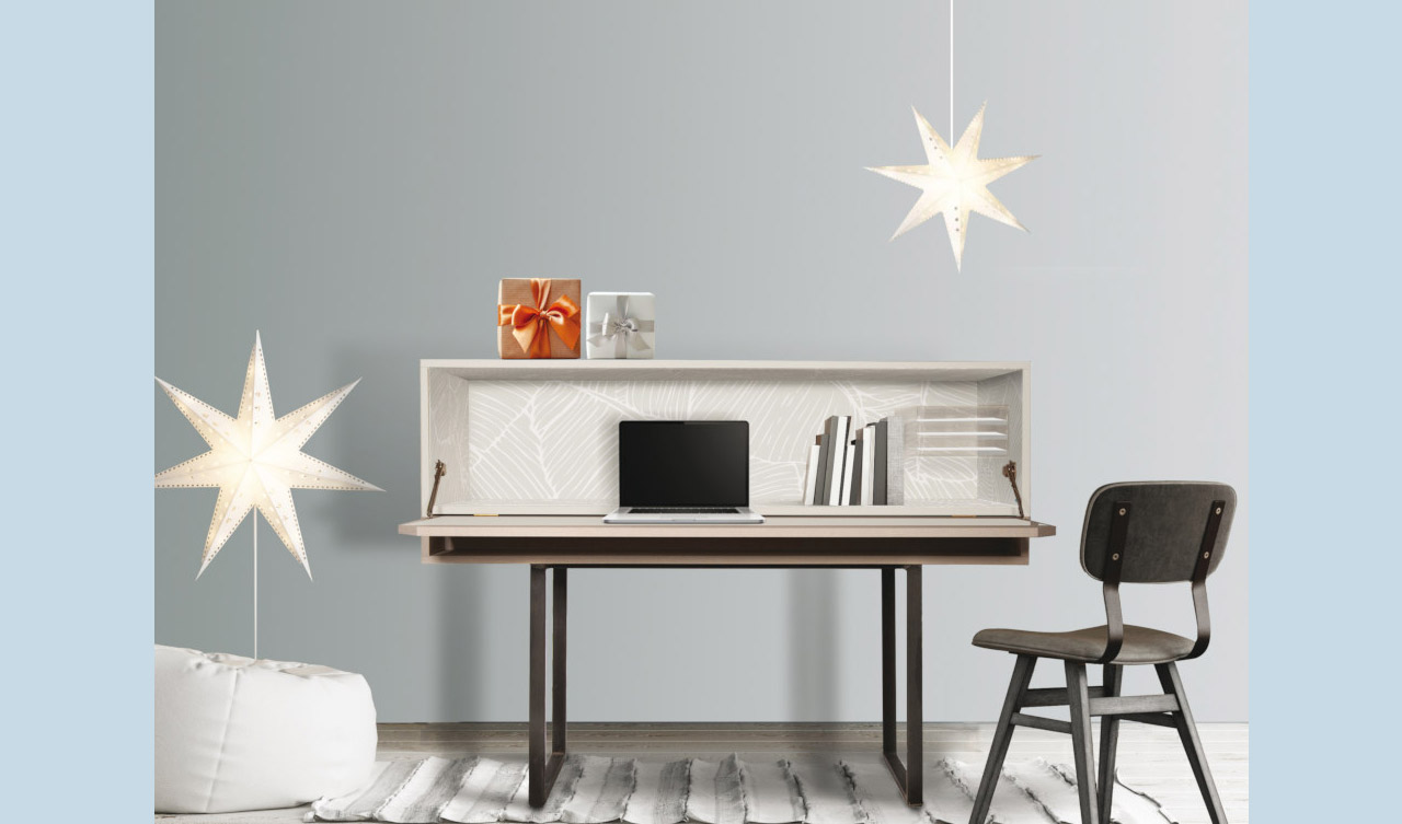 Here we have a piece of living room furniture which, for all intents and purposes, looks like a simple sideboard. However, it casually conceals a well-equipped study within itself. With homes becoming more and more fluid, spaces and functions are getting combined to keep everything tidy and nearby. In this context, a drop-down desk is the must-have piece for a “smart” lifestyle. Minimal yet practical, elegant yet flawless, it matches perfectly with the Fifties-style chair and allows you to work both comfortably and stylishly. And when you want to kick back, all you need to do is close the panel and get comfortable in the large white pouf and stretch your feet out onto the carpet. Lastly, the light calls back to Christmastime and instantly adds a bit of magic to the space.