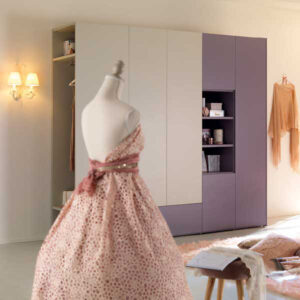 This room with warm and sophisticated colors has been designed for a girl with refined taste. The YC302 compositions pairs birch wood with taupe and mulberry lacquers to create a comfortable, harmonious, and functional space which includes a study area and a versatile closet.