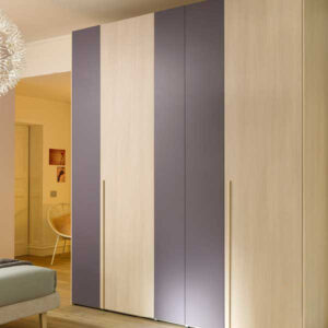 The doors with varying widths provide visual rhythm and personality. The alternation of larch and mulberry adds a sense of depth and allows the wardrobe to both furnish and decorate.