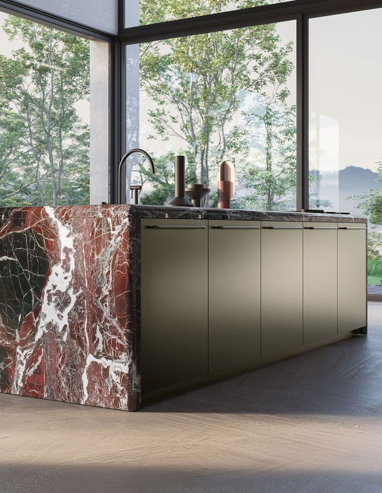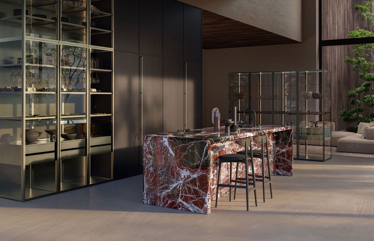 Within this design framework, Rosso Levanto marble takes on the role of a material accent, cladding the central island like a sculptural monolith.
