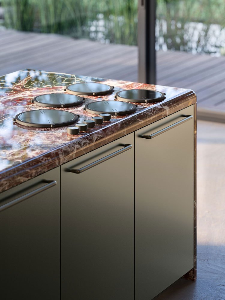 Together, these three elements give shape to a contemporary kitchen that combines aesthetics, technology, and design flexibility, creating an elegant and tactile environment that integrates seamlessly with the living area.