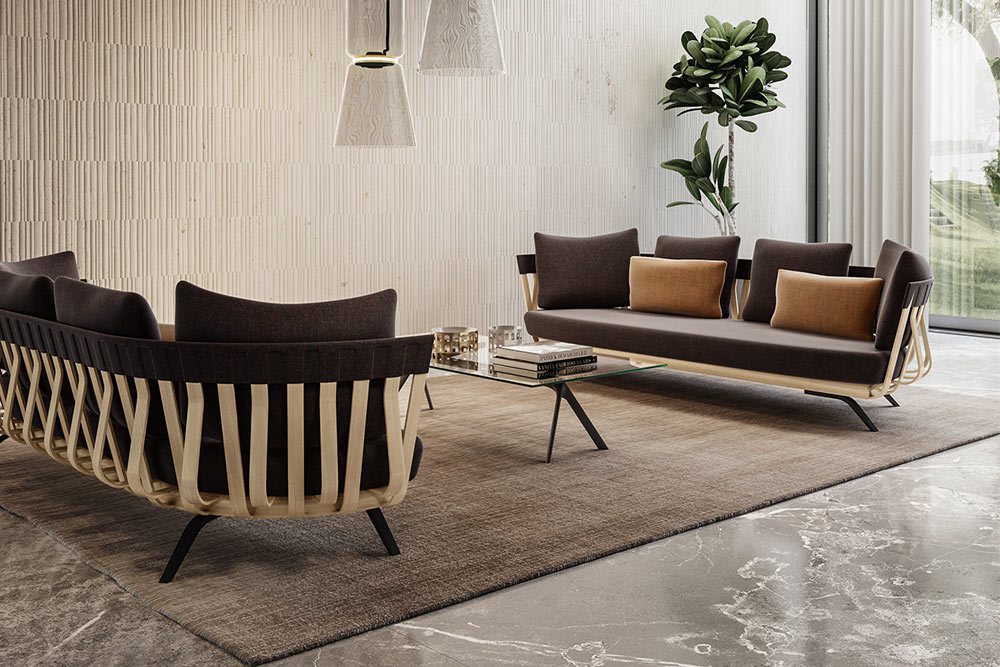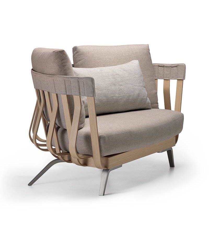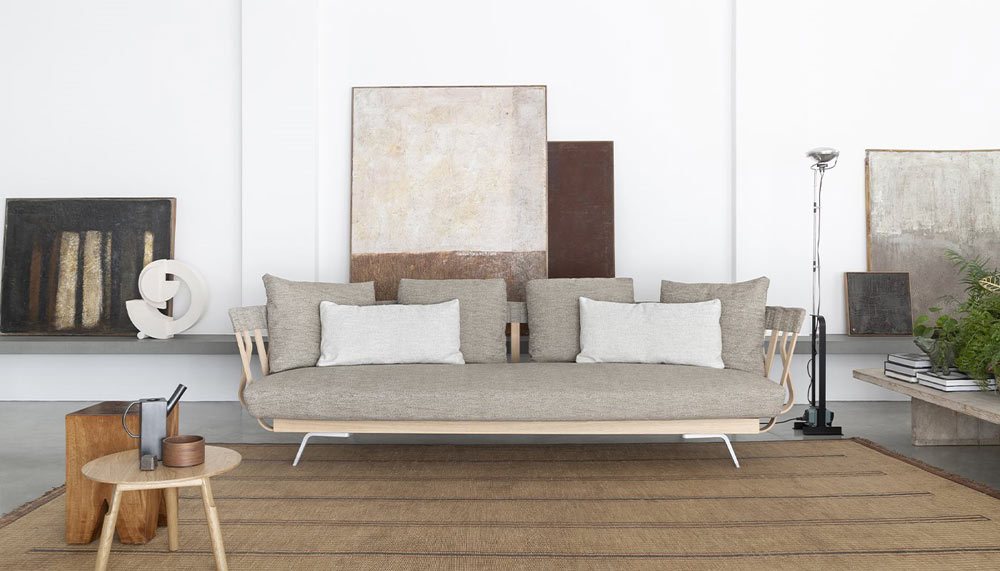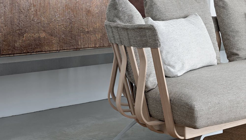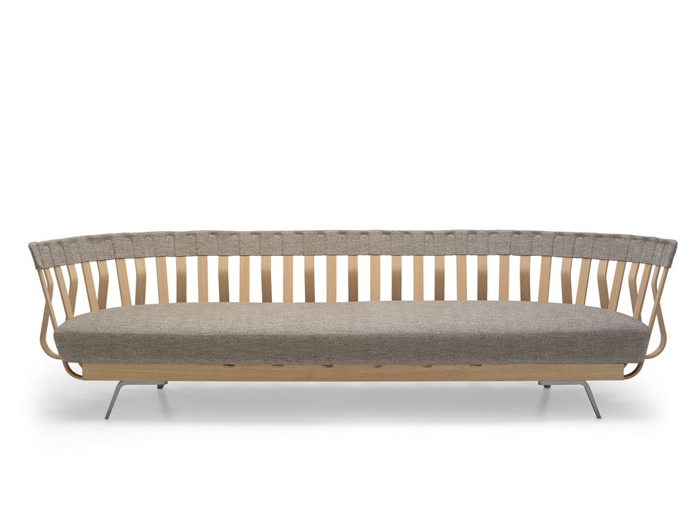 - How it is made The structure is made up of visible slats and elastic ribs attached to two wooden rails and suspended on aluminum feet. The curved multilayer ash and oak give shape to a sinuous, light and bold form that embraces the large cushion. The fabric belt that frames the structure allows for a better distribution of the weight so the sofa can perfectly fit to our bodies.
