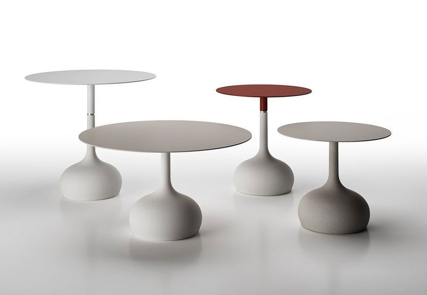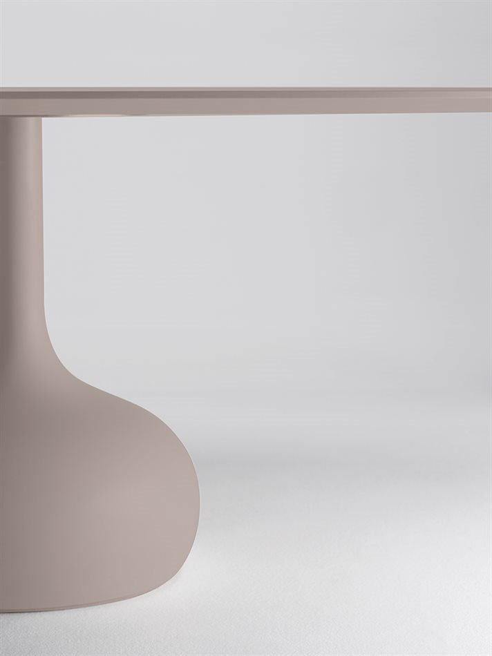 - How it is made It is a round table with a central base made in compact rigid polyurethane which offers high technical and aesthetic performance. Resistant and sculptural, it has the shape of an upside-down wine glass with a slender stem with textured paint and an MDF or lacquered wood top in various finishes. In contrast with the original 2015 project, the base is made in rigid polyurethane (no longer concrete) and allows for the creation of uniform and clean surfaces.