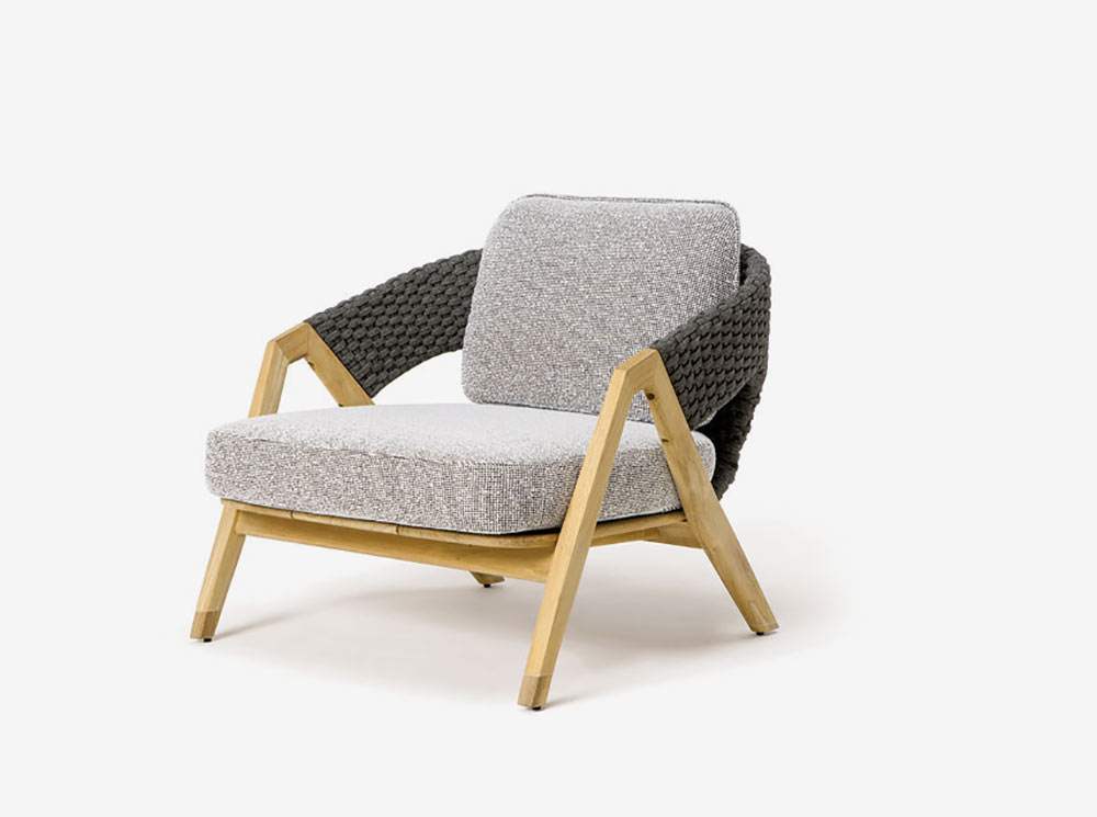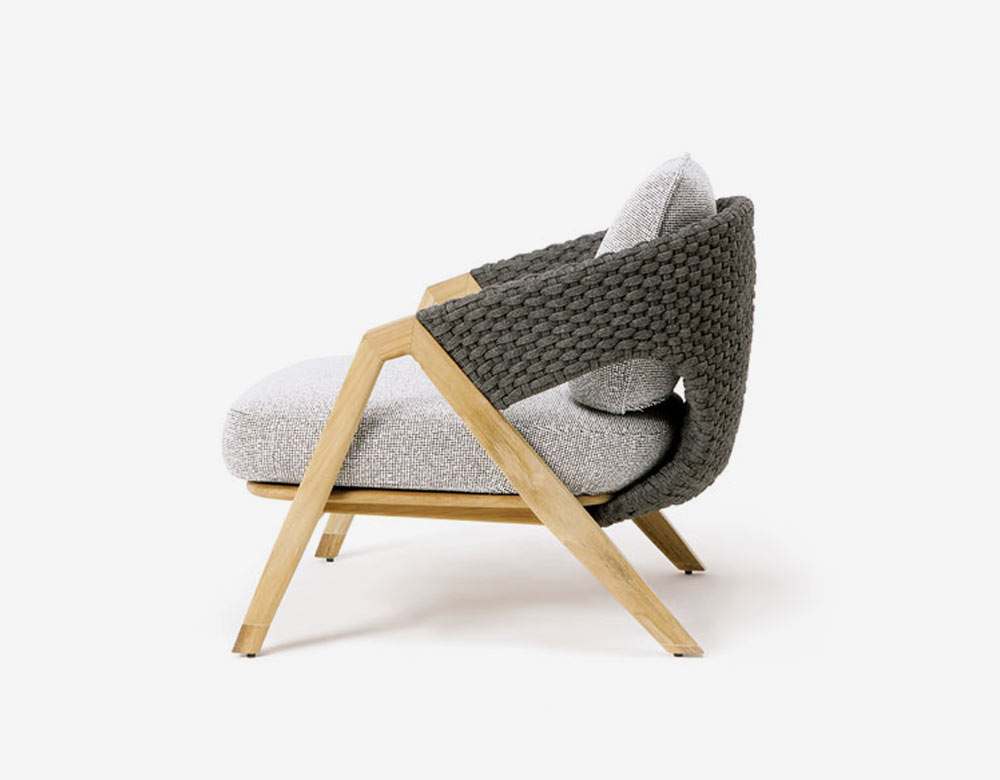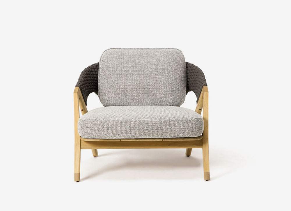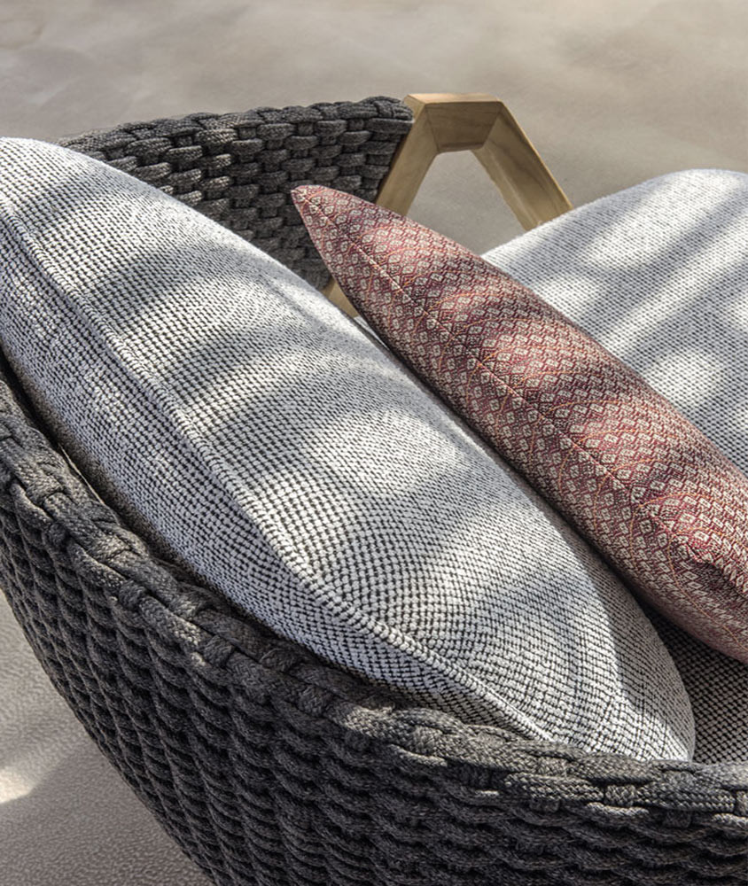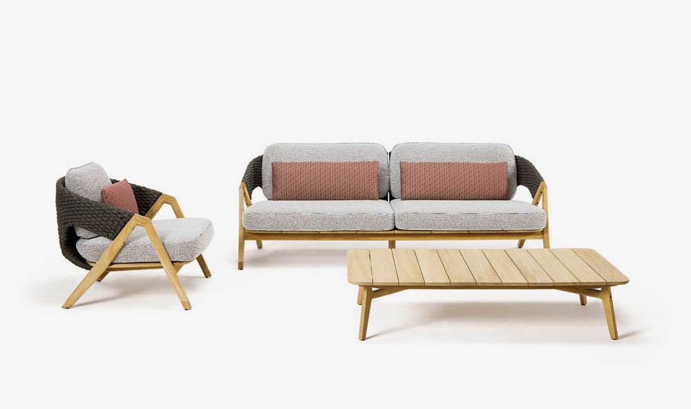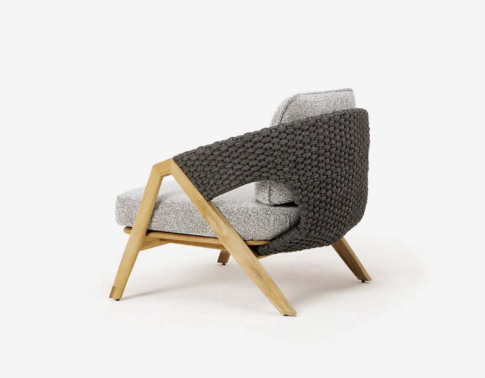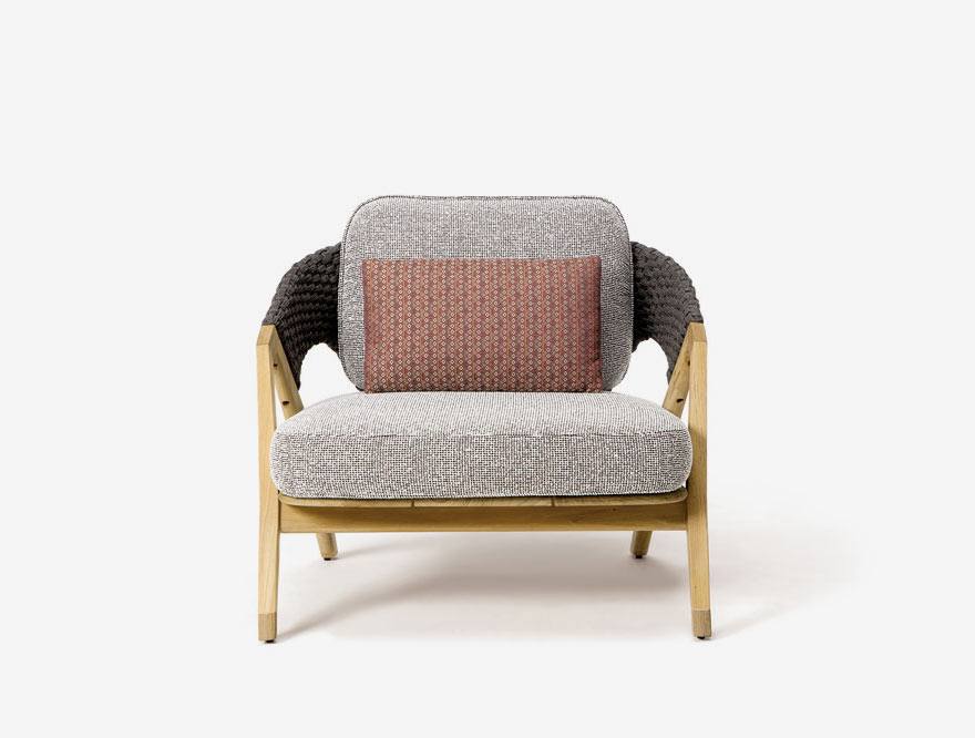 - How they are made The sofa and armchair play with large, enveloping proportions and soft volumes capable of keeping the aesthetics light and sophisticated while focusing on ergonomics and comfort. The structure is made out of finished or unfinished teak to which the rope making up the seats is woven. The seat and backrest cushions are covered with the new and refined Chess and Red Diamonds fabrics.