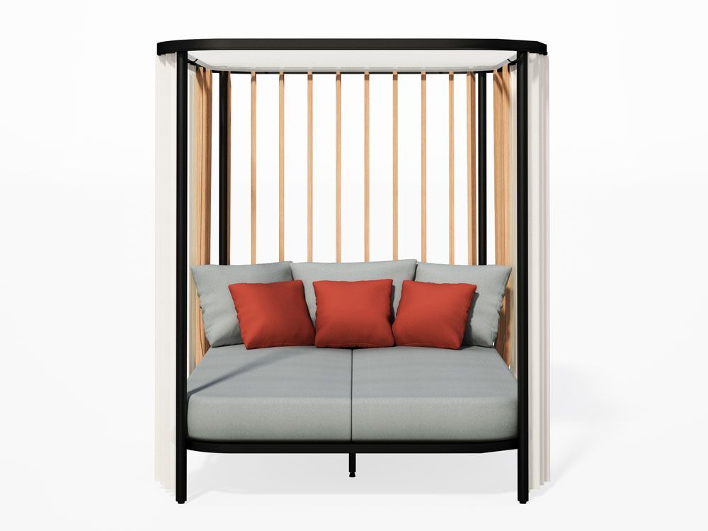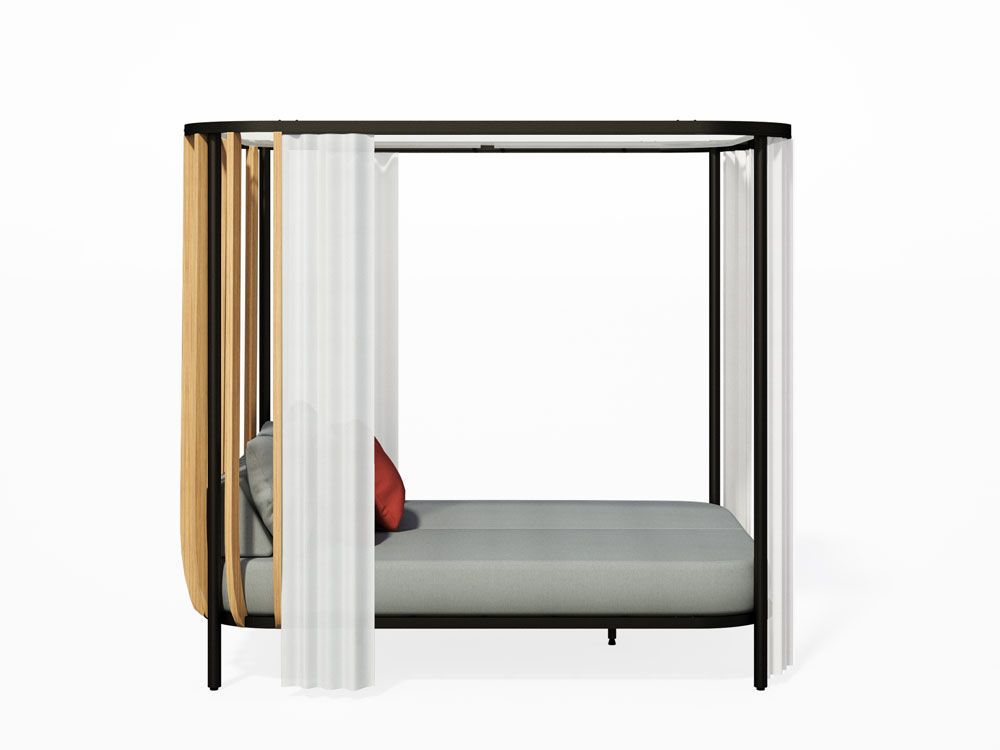 It is a canopied alcove that continues with the collection’s unmistakable “architectonic flourish” of natural or pickled teak repetitions and a new stainless steel structure in two color variants (Sepia Black and Warmwhite). Finishing off the composition, there are fabric curtains and a soft mattress (which you can match with decorative pillows) that offers the same comfort and support of a real bed.