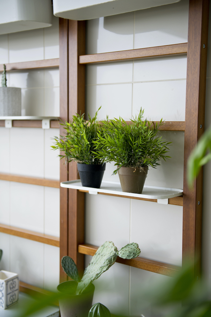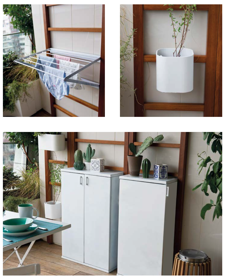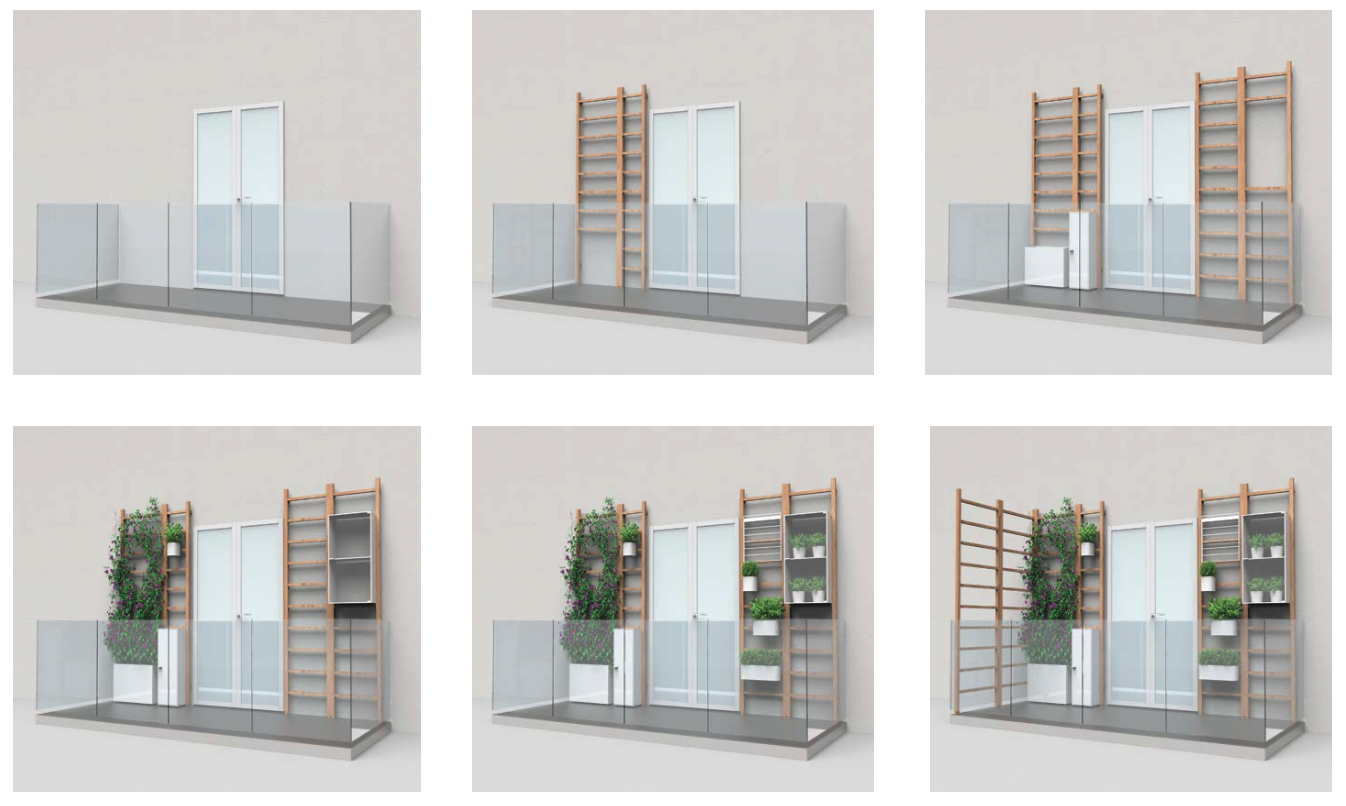 - How it is made The versatile, customizable and freely modular system Urbn Balcony is made up of so-called “ladders” to attach to the walls, ceiling or railing— made in wood and available in three widths (37-53-69 cm) and two heights (117 and 265 cm)—with various small, white aluminum cabinets with doors (for storing that which must remain hidden) or nets (for greenhouse use), and a series of accessories—including trays, vases and a drying rack attachable to the ladders’ rungs.