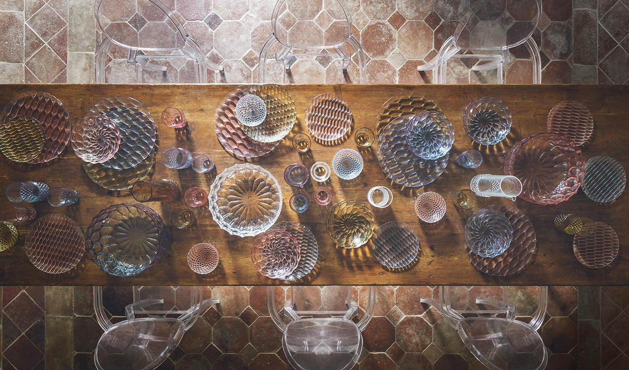 These plates, trays, glasses, bowls, carafes, coffee cups and sugar bowls have various patterns that recall gelatin. It is the perfect table set to create a whimsical yet refined mise en place.
