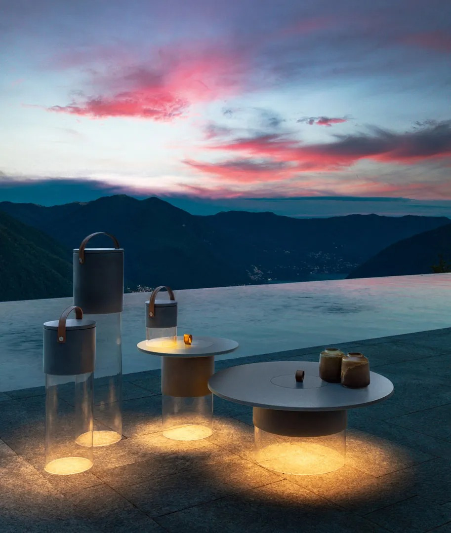 What’s special about this outdoor table with a resin surface and methacrylate cylindrical base? Its internal lighting turns it into an unusual lantern so you can create the perfect atmosphere.
