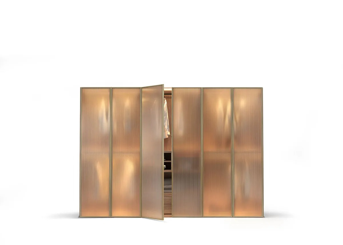 An homage to glass, its perimeter frame with a chamfered edge frames the door discreetly by turning glass into the true highlight of the room. The Murano door, which is available in transparent or reeded glass, can be used with the new Teatro and Sipario walk-in closets.