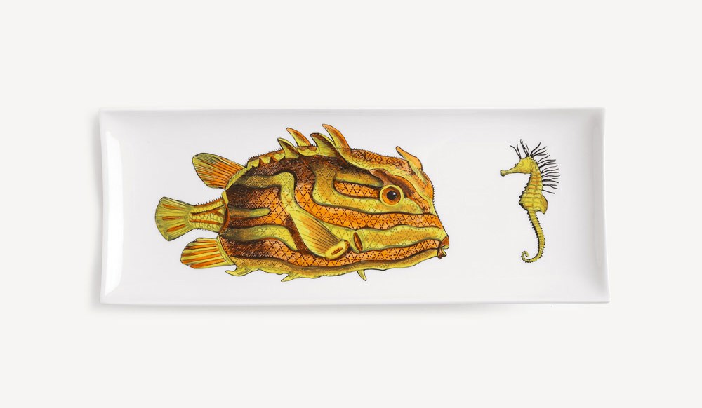 It instantly becomes summer when a fish and seahorse meet on this hand-painted and lacquered tray.