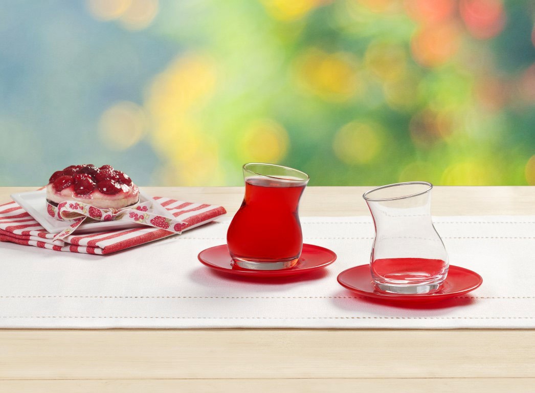 To perfectly serve infusions and refreshing herbal teas, there is this fire-red saucer for glass teacups with a rounded and slightly asymmetrical form.