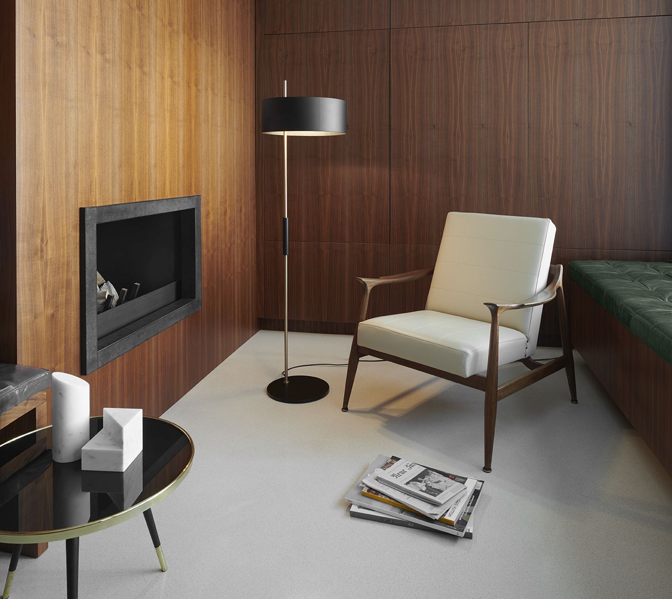 Let’s start with one of Oluce’s new releases. Parallel is a floor lamp made up of a solid lateral stem created with two metallic parallel plates and a cylindrical lamp shade covered in hammered leather. This unexpected material paired with minimalist lines is what gives Parallel its striking look. Geometric, modern, and refined, this reading lamp is able to be placed in various spaces.