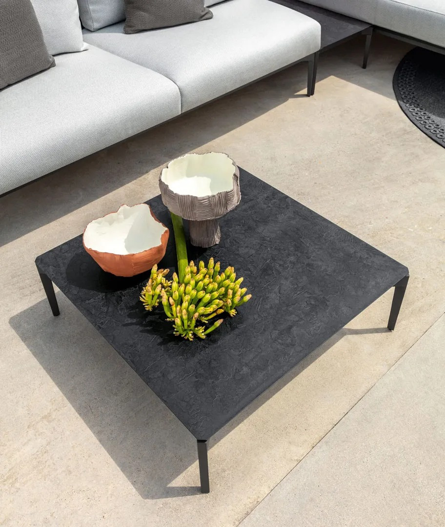 We also are thrilled about the Leaf coffee table which comes in various versions and forms with a Vitter top—a strong, fireproof, antibacterial, state-of-the-art, compact laminate with full interior and exterior coloration. Talenti uses this innovative material to create a scratched and natural look.