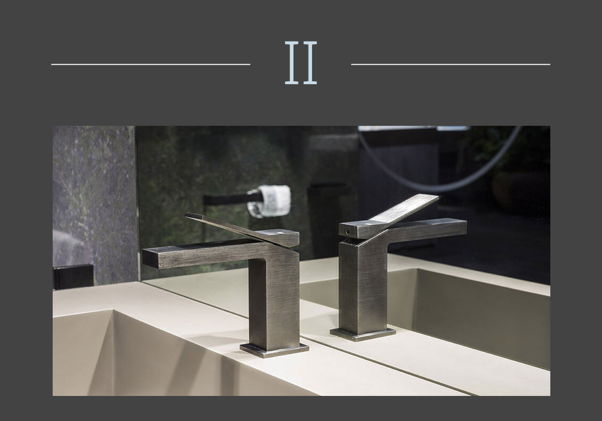 Funziona tramite un’unica leva per regolare l’intensità del getto (dal basso verso l’alto) e la temperatura (da destra, fredda, verso sinistra, calda). Il miscelatore Rettangolo K di Gessi con la leva sopra la bocca è un vero e proprio elemento scultoreo per un bagno di forte impatto.