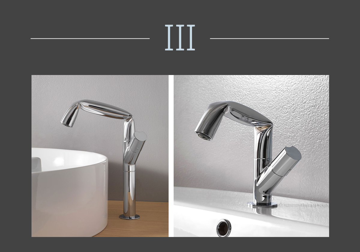 Moltissimi modelli sono declinati in più altezze per adeguarsi ai diversi lavabi. I miscelatori alti sono però spesso scelti per la loro comodità, perché consentono di mettere sotto la testa e lavarsi i capelli al volo. Per un design atipico e ironico, il miscelatore Fold di Flaminia, dal tubo schiacciato per la piega.