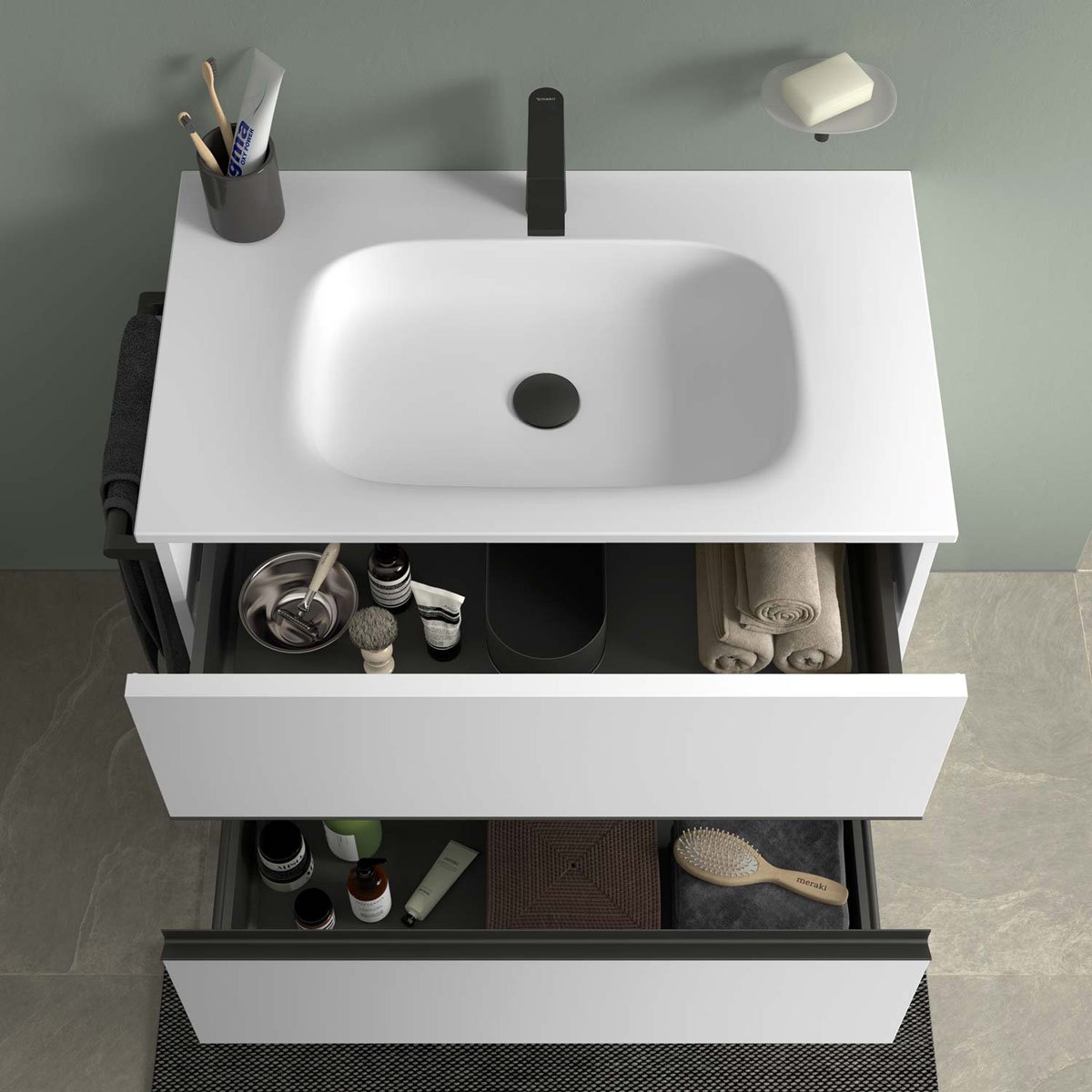 Un aspetto distintivo di Sivida è sicuramente quello dato dal DuroCast®, un materiale ricomposto minerale dall’effetto vellutato sia al tatto sia alla vista, utilizzato per lavabi e consolle. In questa collezione è proposto sia in monocromatico sia nella variante bicromatica per donare un tocco vibrante all’ambiente.