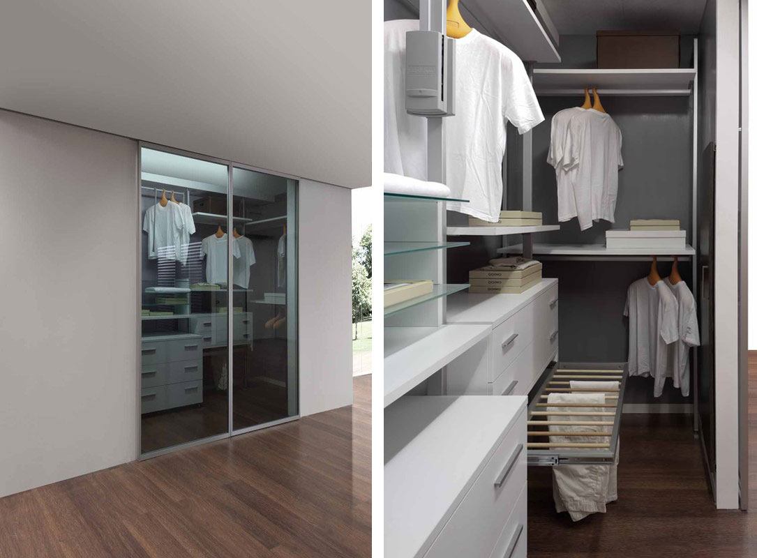 Sogno di tutti noi, la cabina armadio personalizzata esiste anche nelle dimensioni minime di 120 cm di profondità. Mensole, vassoi estraibili, cassettiere e porta pantaloni si dispongono lungo il sistema di profilati. Per chiuderla, pannelli fissi e ante scorrevoli cieche o trasparenti realizzate su disegno. Cabina armadio, soluzioni su misura di Viva Arredamenti.