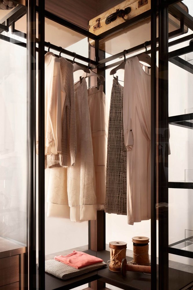 La novità più importante sono i nuovi fianchi a telaio con cui Lema reinterpreta in chiave hitech la progettualità degli armadi, mentre la scelta di materiali riciclabili al 100% apre le porte al mondo green. Il nuovo Armadio al Centimetro, infatti, è composto da un insieme di telai in alluminio, uno interno e uno esterno, disponibili in due finiture: bronzo e sand. Lo schienale esterno è chiuso da un fondale in vetro (al posto del classico fondale in melaminico) in tre finiture di trasparenza, come per il fianco terminale: vetro trasparente extralight, vetro bronzo riflettente e vetro fumè grigio. In facciata, invece, si può scegliere qualsiasi tipologia di anta battente con una cerniera Anta Dandy in versione 180°, altra novità rispetto al progetto originale. Infine, si può avere anche il fianco a telaio in versione Open, cioè senza ante e con luci a LED inserite sui montanti verticali anteriori e nei ripiani.
