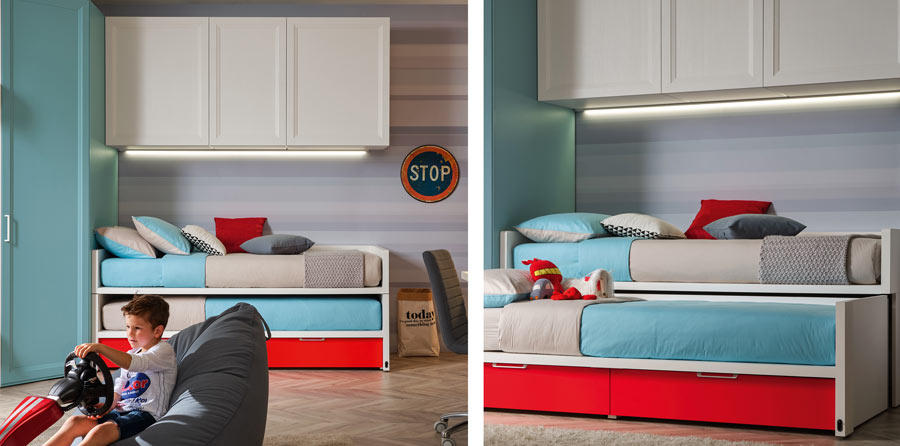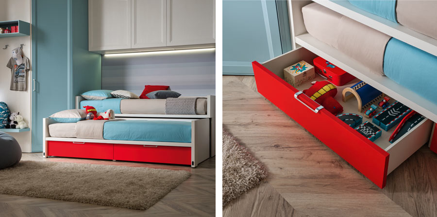 1 Il letto: scorrevole a scomparsa, con cassetti. Non solo un letto in più, da estrarre facilmente grazie alla maniglia a incasso, ma anche due pratici contenitori dove sistemare giochi, coperte e indumenti. Tutto con il minimo ingombro di un letto singolo. (Space di Vogue Collection)