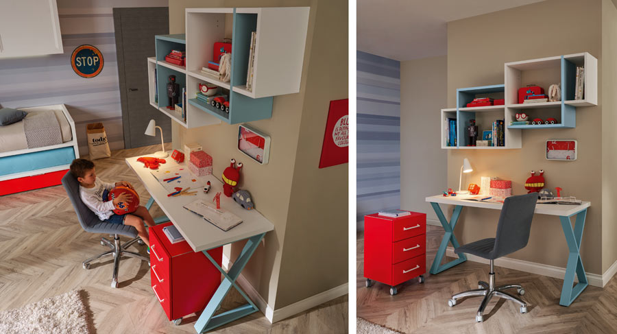 3 L’angolo studio: completo e super accessoriato, ma versatile e poco ingombrante. Scrivania a cavalletto, cassettiera su ruote, sedia ergonomica e libreria modulabile a parete: pochi elementi semplici e leggeri, che non appesantiscono l’ambiente e si possono sistemare a piacere e spostare all’occorrenza. La proposta perfetta per studiare da soli o con gli amici e avere tanto spazio per giocare, quando non servono.