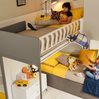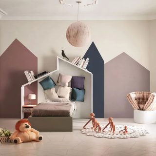 Il letto con l’armadio a ponte disegna al centro della cameretta un piccolo “nido” accogliente, che delimita alla perfezione la zona notte. Essenziale, ma impreziosito dalla parete decorata dell’armadio, il letto diventa così il protagonista assoluto nella stanza dei ragazzi, ma senza togliere spazio a gioco e studio.