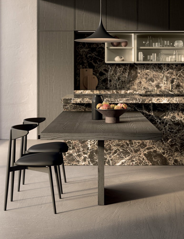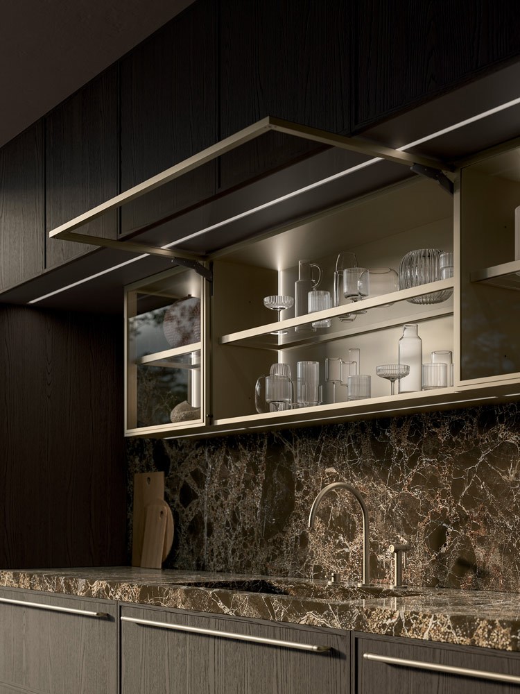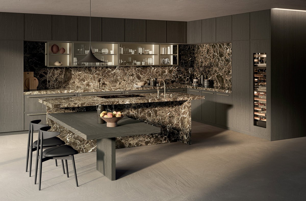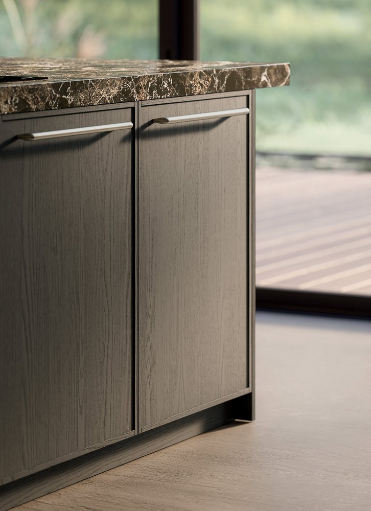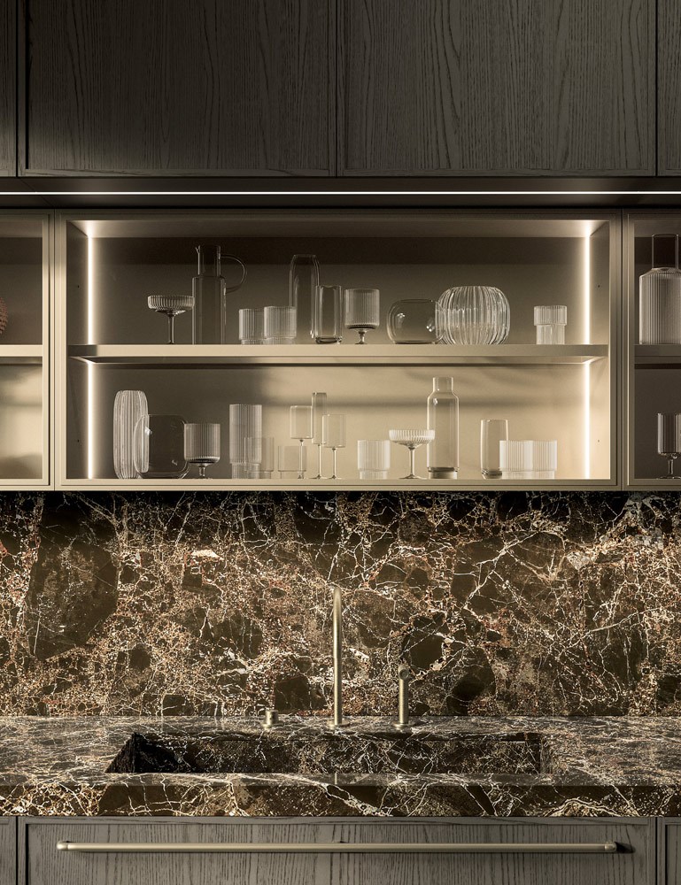 A dialogare con la pietra c’è il rovere sabbiato Piombo, profondo, materico, dalle tonalità intense. I frontali, incorniciati da un profilo sottile di soli 14 mm, esprimono rigore e leggerezza, dando vita a volumi puri che alternano pieni e vuoti in un equilibrio misurato. Non ci sono eccessi, solo la forza del dettaglio, la qualità del materiale e una cura artigianale che emerge in ogni giunzione.