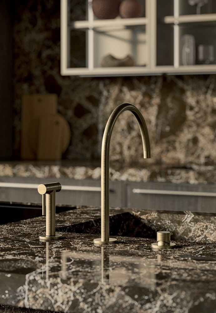 Il marmo Emperador, pietra naturale originaria del sud della Spagna, dal fondo marrone con venature chiare e riflessi dorati, è utilizzato per il piano e i coprifianchi con uno spessore importante di 60 mm, che include anche il lavello integrato.