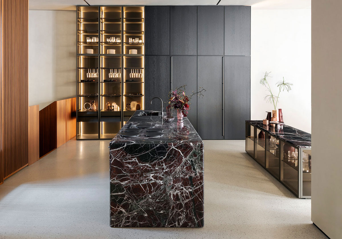 Quando la cucina diventa scultura. L’isola protagonista di questa composizione è un monolite in marmo Rosso Levanto, lucido e vibrante, che definisce con forza lo spazio centrale dell’ambiente.