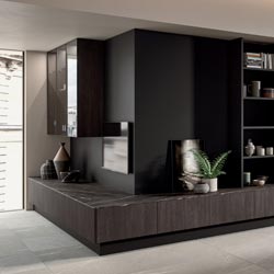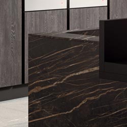Materiali pregiati e venature chiare a effetto marmo: per un’eleganza sofisticata e senza compromessi.