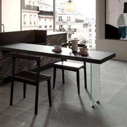 Il piano che funge da tavolo sembra quasi sospeso nell’aria e alleggerisce tutto lo stile