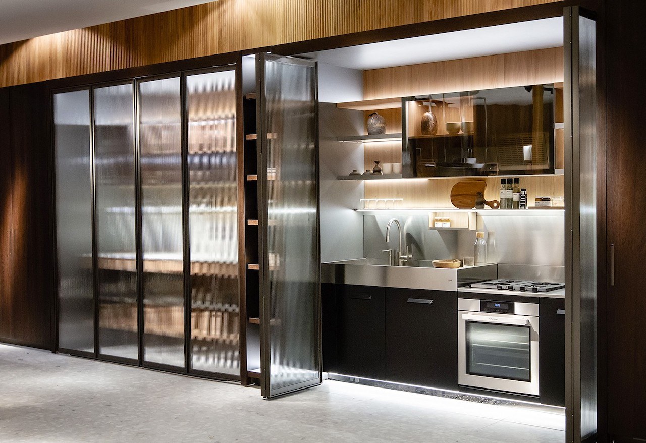 Se, anziché metterla in bella vista, vogliamo nascondere un po’ la nostra cucina combinata al living, possiamo chiuderla come un armadio e decidere anche se nasconderla del tutto oppure lasciarla nel “vedo-non-vedo” con le ante traslucide e una luce soffusa sullo sfondo. Cucina Inside System, design Giuseppe Bavuso 2018, Ernestomeda.