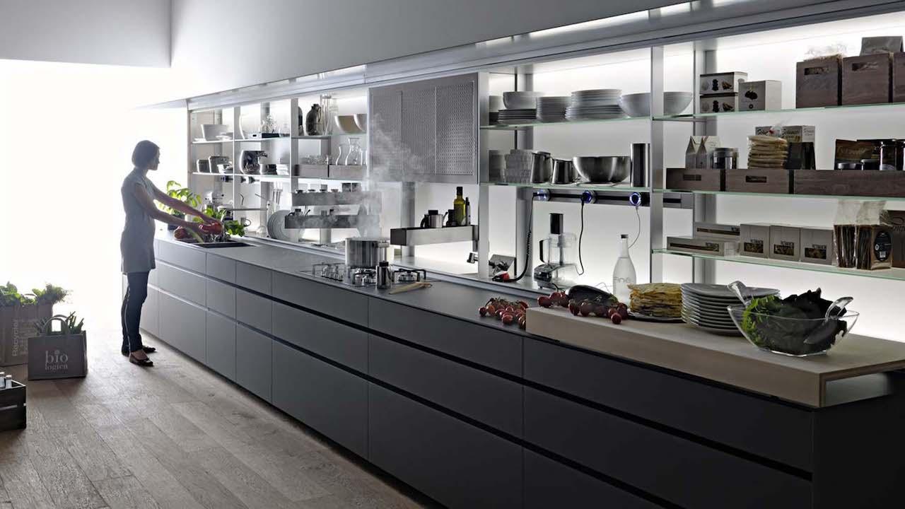 Uno schienale super attrezzato per avere a portata di mano tutto l’occorrente è il sogno di chiunque cucini. Per integrarlo nel living e fare sparire tutti gli attrezzi con il loro inevitabile disordine, Valcucine ha inventato il New Logica System, un raffinatissimo sistema di chiusura. Cucina Artematica Vitrum, vetro grigio cemento, design Gabriele Centazzo 2018, Valcucine.