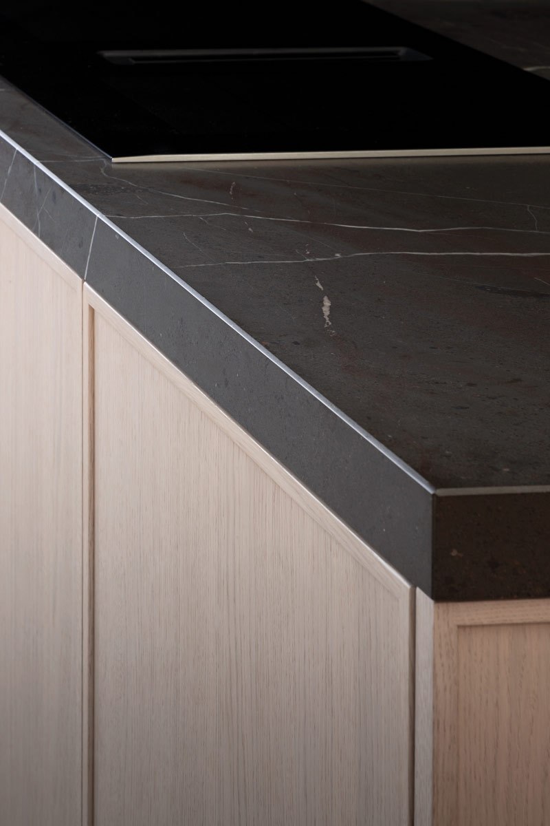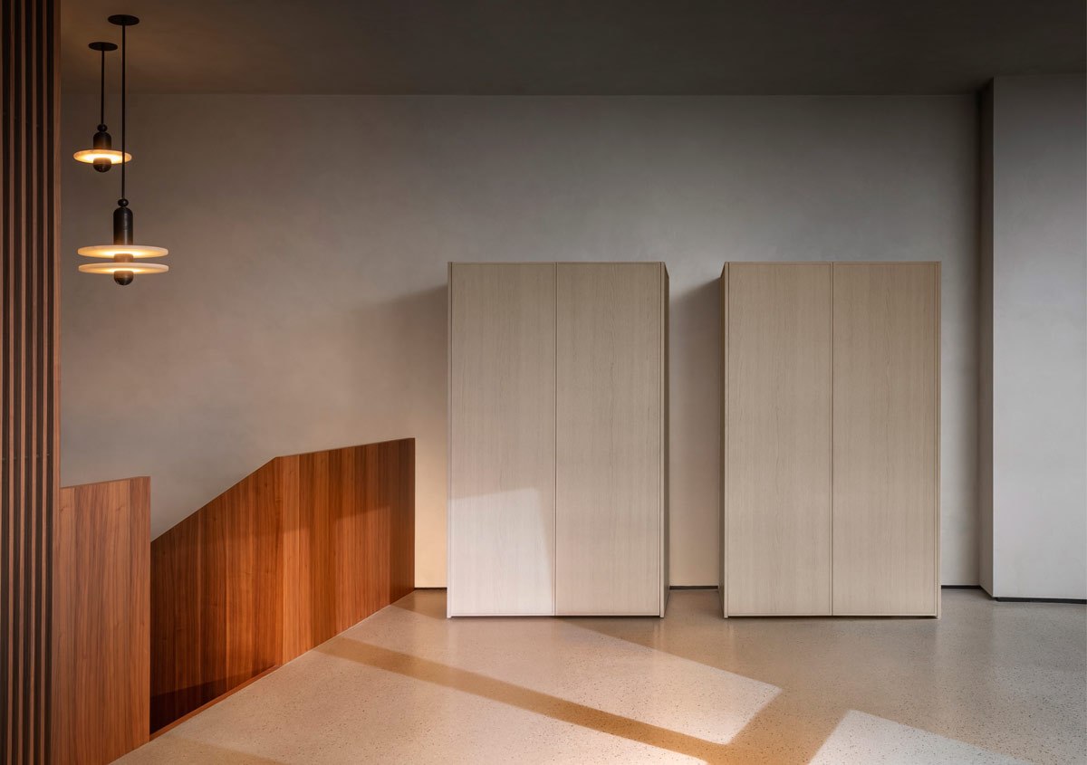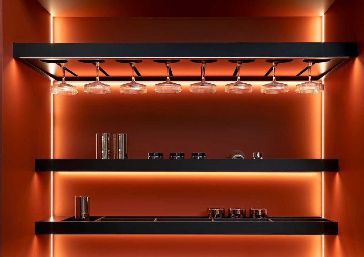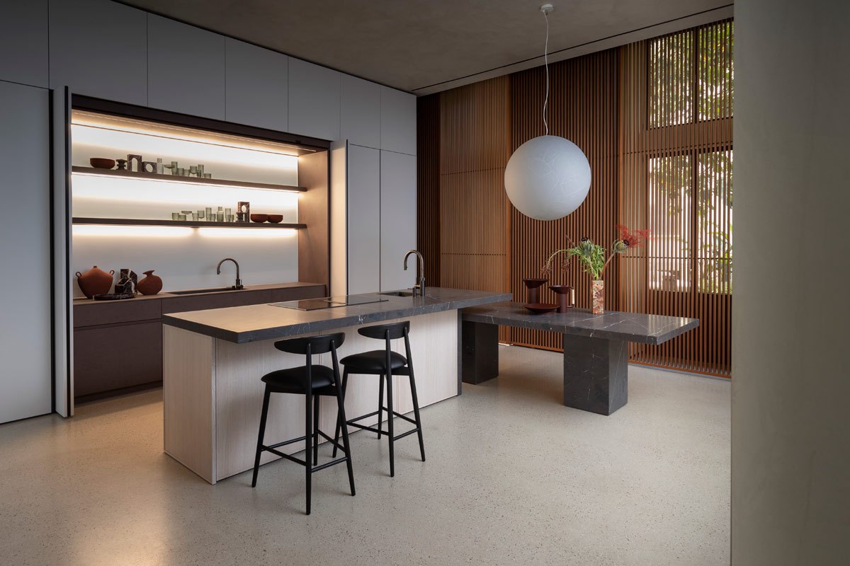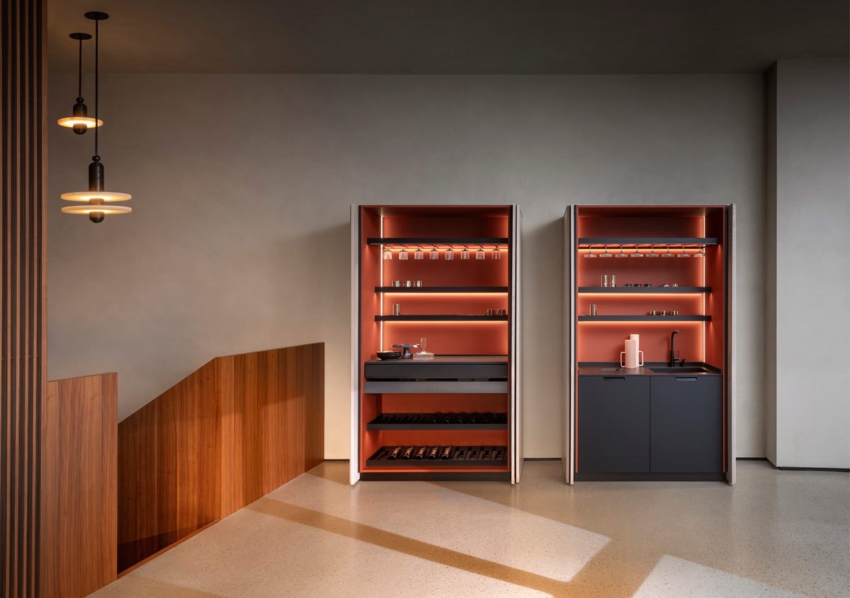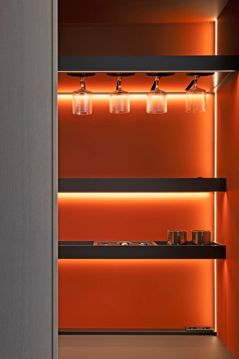 Inoltre alle sue spalle, il modulo Cabinet Folding racchiude la zona operativa in TSS Opus mattone, mentre i pensili sopracolonna in laccato Super Matt Pomice incorniciano armoniosamente l’intera composizione, creando un effetto raffinato.
