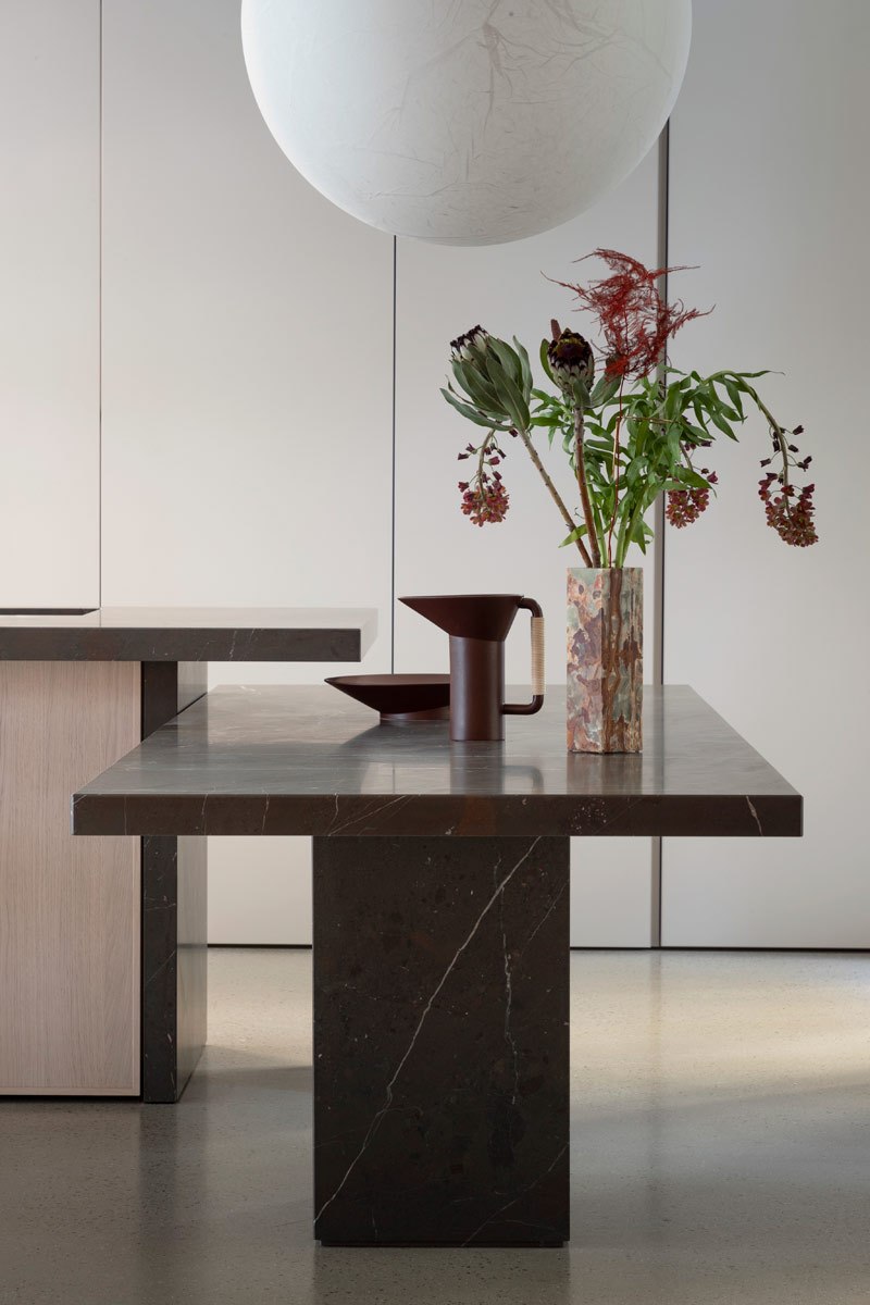 A lato del blocco isola, Margo è affiancata da un tavolo con struttura anch’essa in marmo Breccia Imperiale, che dona una continuità visiva e crea uno spazio funzionale ed esclusivo.