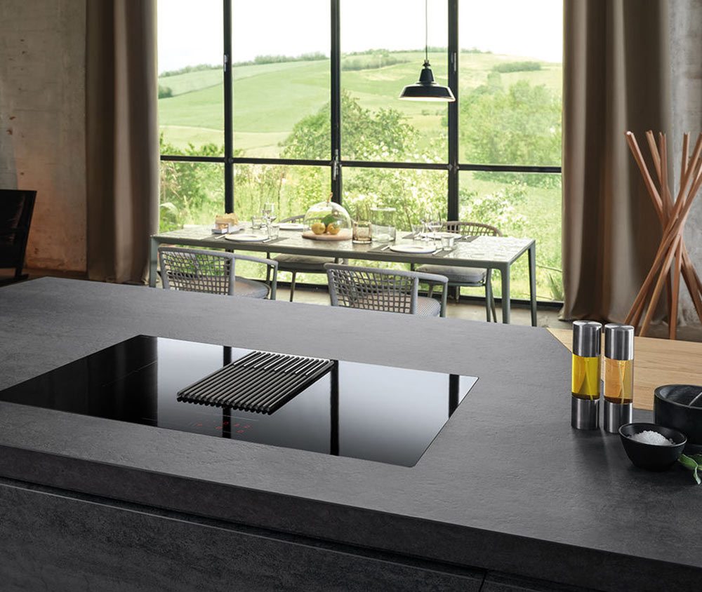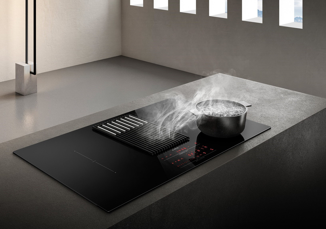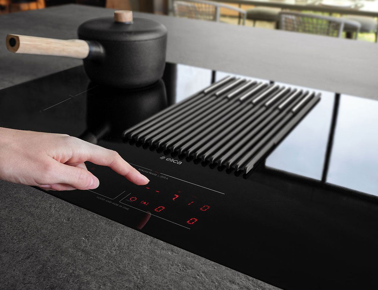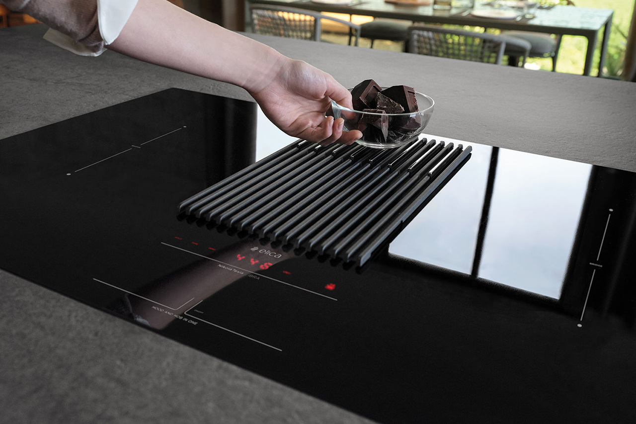 - Com’è fatto E’ un piano a induzione con aspirazione integrata e una bilancia incorporata. Basta appoggiare la pentola sul piano (mentre è spento o accesso) per pesare gli ingredienti contenuti, persino quelli che si aggiungono durante la cottura. Grazie alla funzione autocopture, il piano regola automaticamente l’aspirazione della cappa con una potenza 5 volte superiore rispetto alla velocità di salita dei fumi. Intuitivo e facile da comandare, ha un’interfaccia che permette di controllare le funzioni di cottura, aspirazione e di usare la bilancia anche quando il piano cottura è spento. Il piano con quattro zone cottura a induzione è in vetro e permette di utilizzare due zone adiacenti in modo combinato (per pentole grandi), la griglia è in ghisa (rimovibile e lavabile in lavastoviglie) e nasconde i filtri odore e grasso rimovibili e lavabili. La cappa è disponibile nella versione aspirante e filtrante.