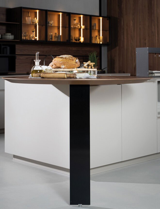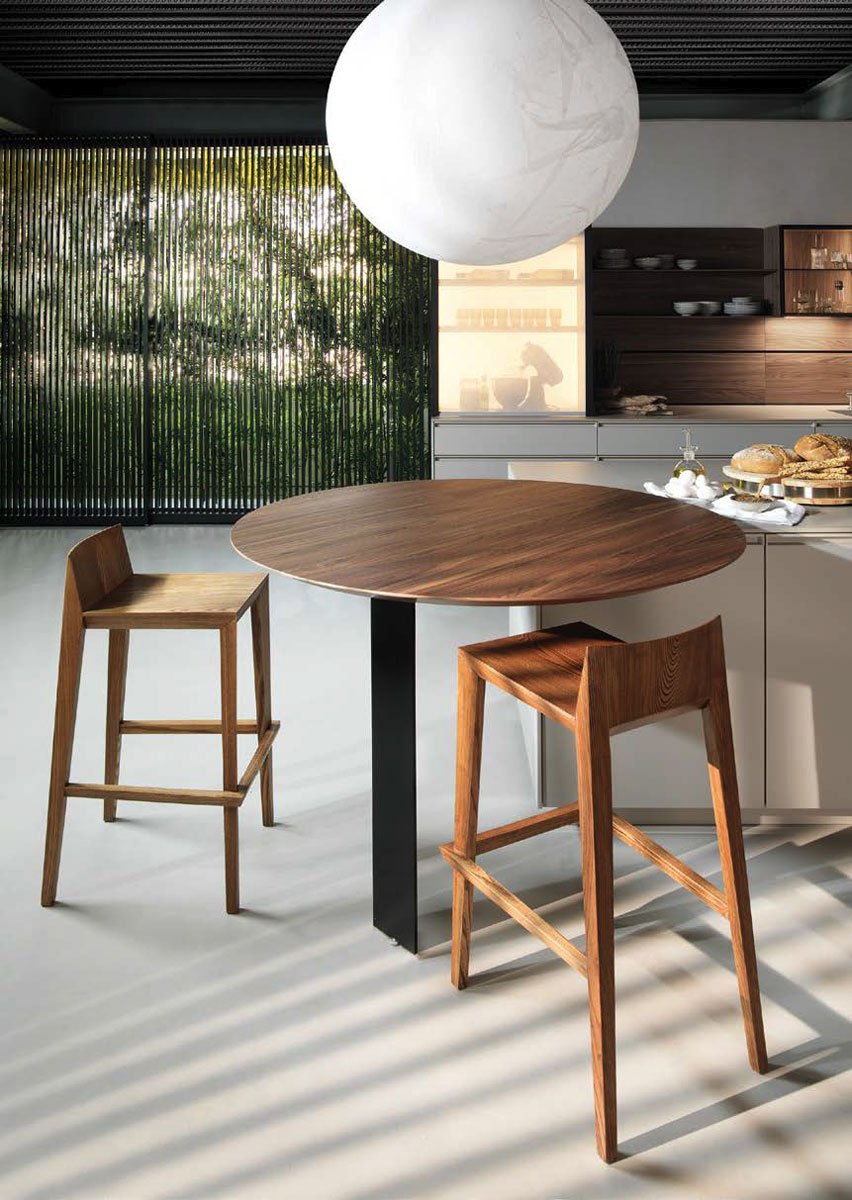 Discreto e raffinato, Rondò è un piano snack costituito da un piano rotondo con una gamba d’appoggio asimmetrica in alluminio nero. Rondò può ospitare fino a quattro persone e può collocarsi sui diversi modelli di cucina di Euromobil. La superficie del tavolo gioca con diverse finiture, dal laminato alle numerose essenze legnose.