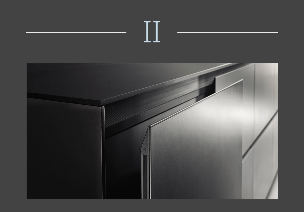 Oltre ad essere più resistente, il laminato si impreziosisce. Le nuove raffinate finiture assumono a sorpresa altre identità, come i laminati metallici o, per delle sensazioni visive e tattili inattese in cucina, addirittura ad effetto cuoio. Cucina Riciclantica Laminato Cuoio, design Gabriele Centazzo, Valcucine 2018.
