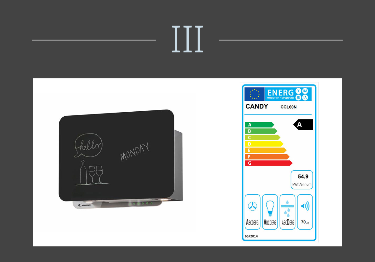 Ogni cappa è corredata dall’etichetta energetica che indica la classe della qualità del rapporto consumi/ prestazioni (da A, il migliore, a G) e il grado di efficienza nell’eliminazione di fumi e vapori, nel filtraggio delle particelle di grasso, nell’illuminazione e il livello di rumorosità. Cappa CCL60N di Candy.
