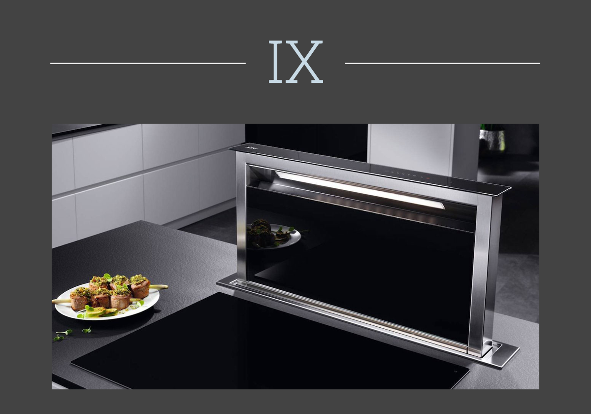 Un altro sistema a scomparsa della cappa è il saliscendi nella base del piano cottura. Con i suoi 90cm di larghezza è ideale per chi cucina con sei fuochi. Si alza tramite un semplice comando a pulsante. È installabile anche nella modalità filtrante. Cappa DDE59080G di AEG.