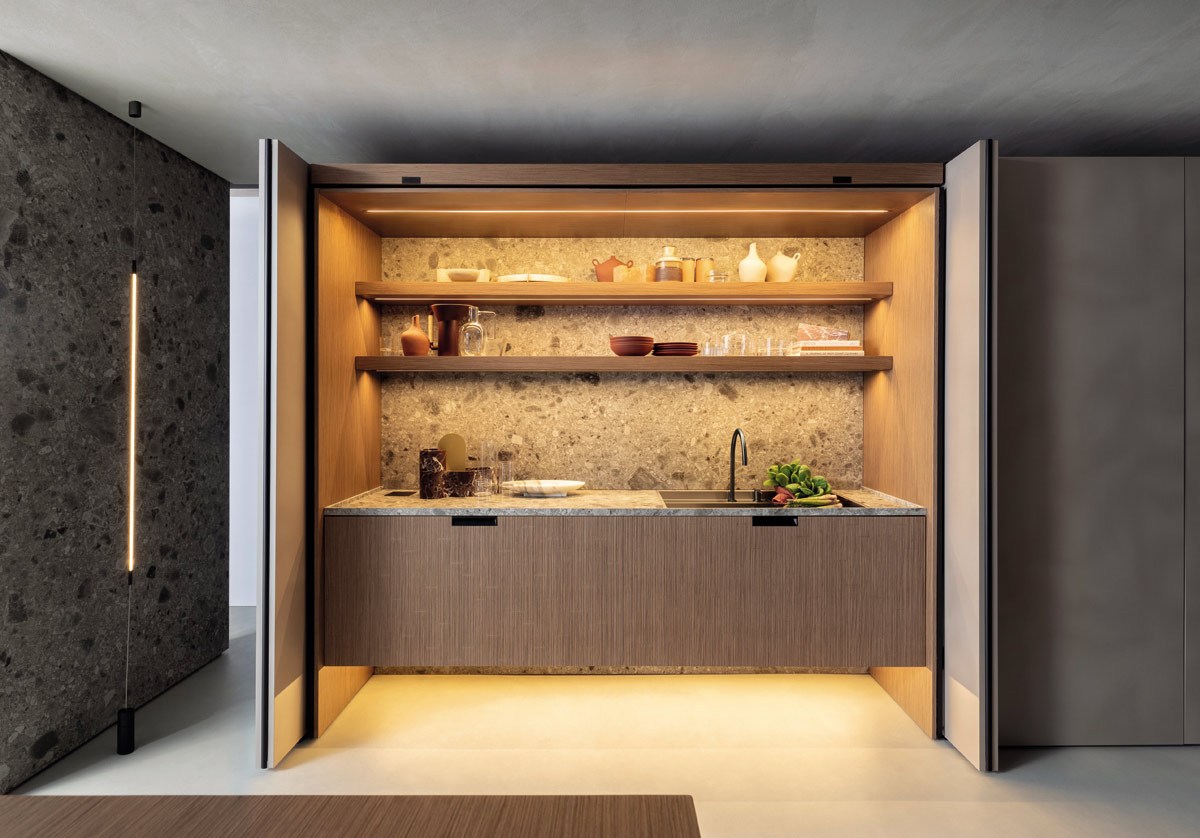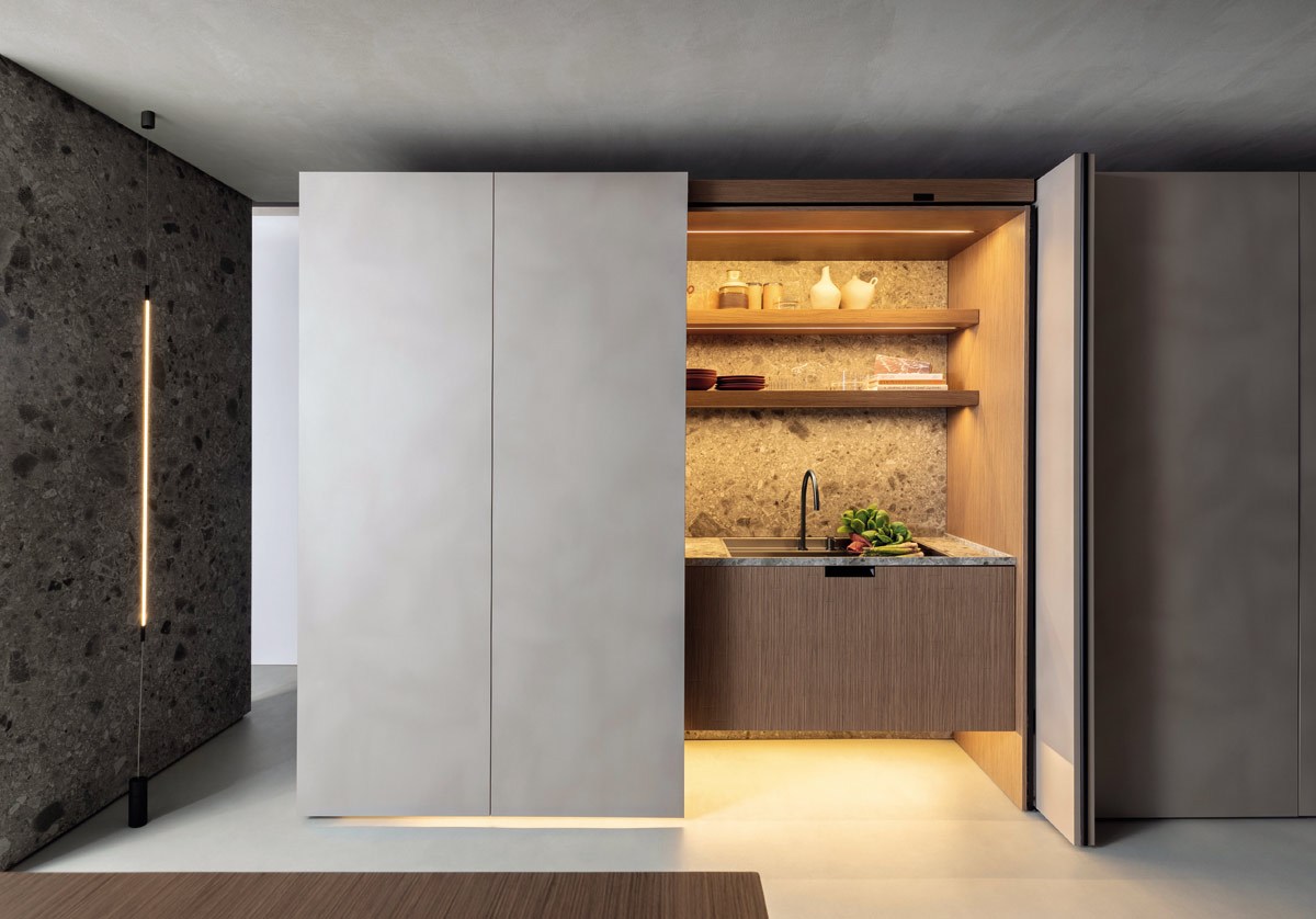 La cucina diventa un ambiente multifunzionale e perfettamente organizzato: questa soluzione è perfetta per chi desidera una cucina minimalista all’interno di uno spazio ordinato e visivamente armonioso.