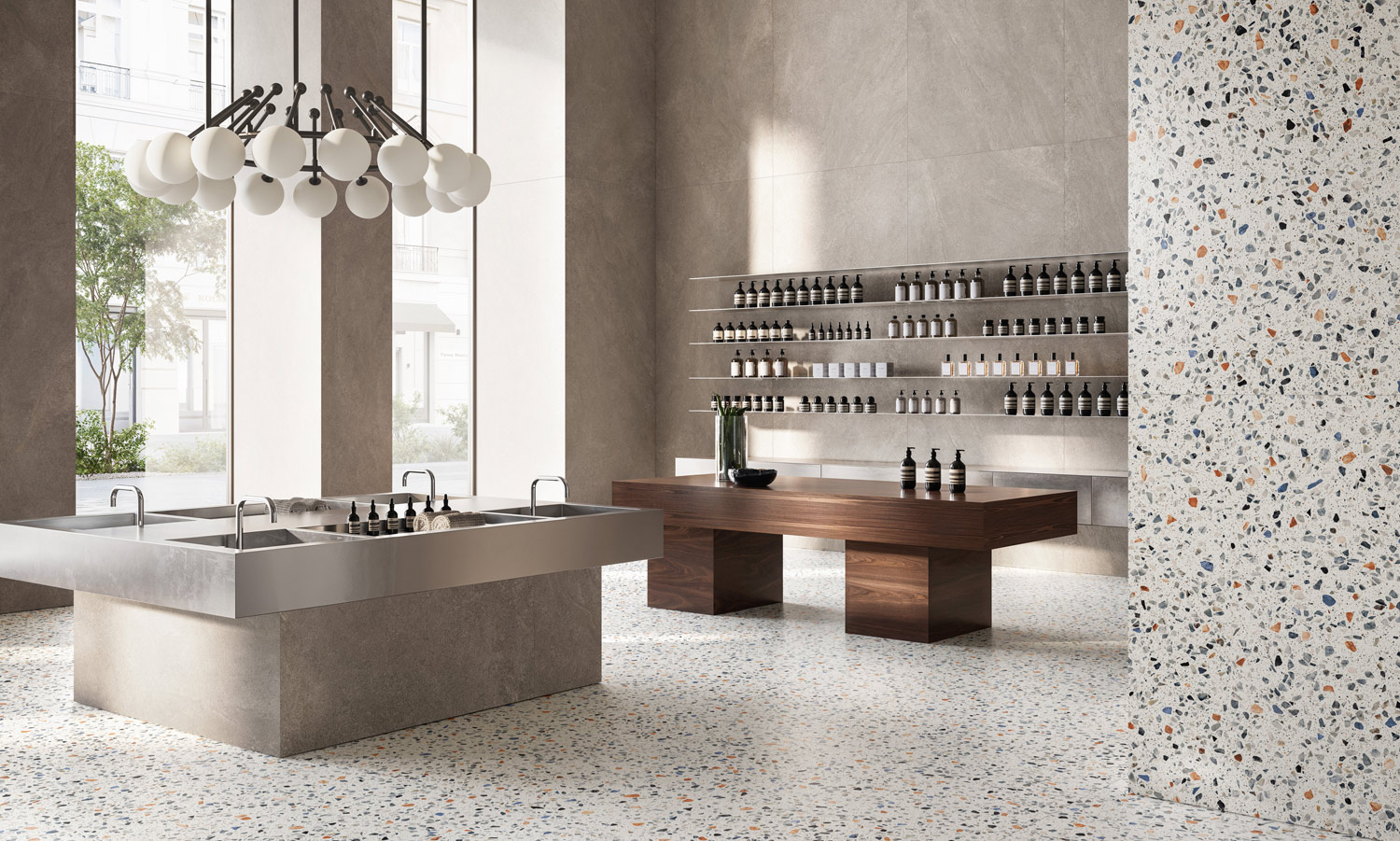 Tra le novità spiccano le proposte di Casalgrande Padana, che con la collezione Elements porta in graniglia un linguaggio sobrio e sofisticato, ideale per residenze e spazi contract. Fioranese conferma la sua vocazione alla ricerca con Bits, che rinnova il terrazzo veneziano in chiave grafica, con formati e palette attuali.