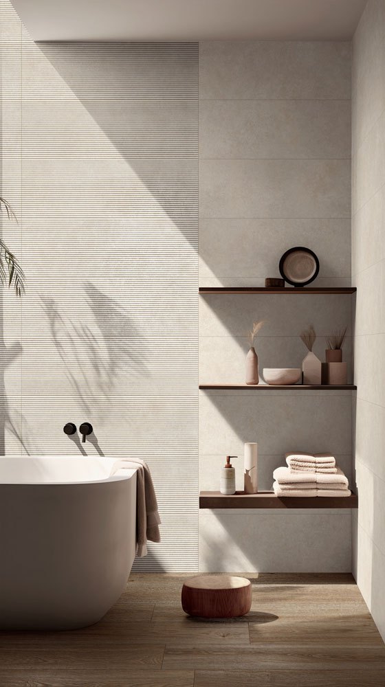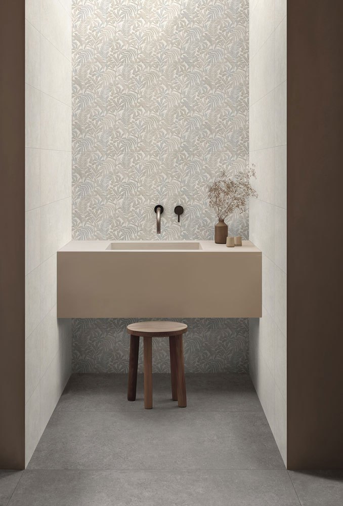 Tiempo Wall di Ragno si abbina perfettamente al gres effetto pietra della collezione, arricchendosi di decorazioni materiche tono su tono. La struttura 3D Saw esalta la profondità della superficie, minimizzando la percezione delle fughe, mentre il Decoro Forest, realizzato con tecnologia Touch, riproduce la ricchezza della vegetazione per una continuità decorativa armoniosa e sofisticata.