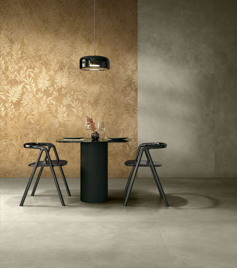 Una delle novità più affascinanti della serie Incanto è la lastra con decoro Golden Leaf, nata dalla ricerca sull’antica tecnica di rivestimento della Foglia Oro. Questo elemento decorativo si distingue per il suo fascino unico, che si discosta dagli effetti marmo più tradizionali della collezione.