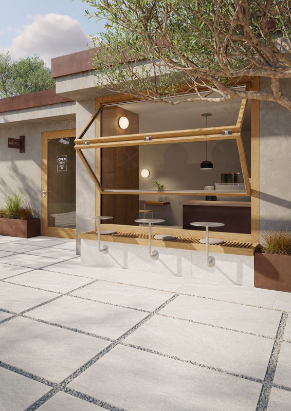 All’esterno, la collezione esprime tutto il suo potenziale grazie alla versione da 20 mm con superficie antiscivolo. Terrazze, patii, bordi piscina e camminamenti diventano estensioni naturali della casa. La possibilità di posa sia tradizionale sia a secco su ghiaia o erba consente una grande libertà progettuale, perfetta per chi desidera spazi fluidi e armoniosi.
